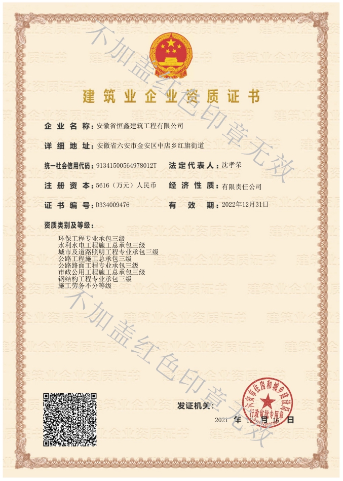 安徽省恒鑫建筑工程有限公司成立于2010年11月,是一家以房屋建筑、市政工程,水利水電、公路橋梁、建筑智能化等施工為一體的民營企業(yè),經(jīng)過多年的發(fā)展,企業(yè)注冊資本5616萬元人民幣,現(xiàn)有員工150余人,獲得本科以上學歷的人員近20%,大專以上的人員超過50%;二級以上注冊建造師18人,中級以上職稱人員100余人。